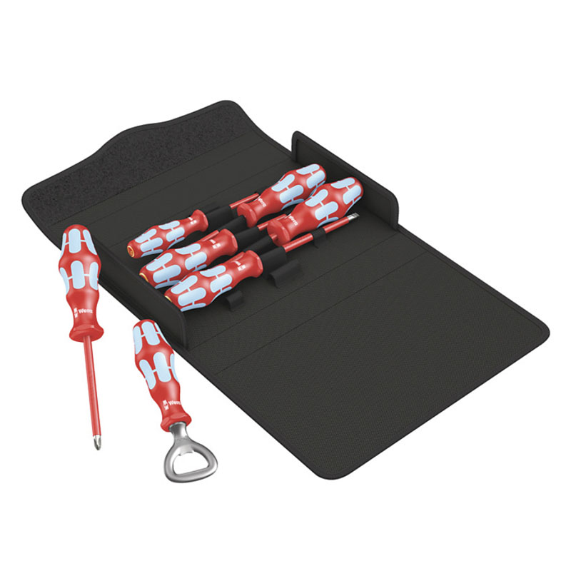 6-delige VDE schroevendraaier set in handig etui. Hoogwaardige Kraftform Plus VDE-schroevendraaierset van RVS van Wera. Al het RVS gereedschap van Wera wordt vacuümijsgehard en beschikt daardoor over de vereiste hardheid en vastheid voor de schroefwerkzaamheden. Industrieel gebruik is zonder enige beperking mogelijk. Het stuksgewijs testen van de Kraftform Stainless VDE-schroevendraaiers in een waterbad bij 10.000 V conform DIN EN 60900 (IEC 60900) biedt de garantie voor veilig werken bij de toegelaten spanning van 1.000 V. Ook onder extreme gebruikscondities is de veiligheid gewaarborgd; het gereedschap wordt immers getest op koudslagvastheid bij -40 °C. Overwegend met Lasertip-punt: De Lasertip-punt grijpt zich vast in de schroefkop en voorkomt wegglijden uit de schroefkop. Meerdelige Kraftform-handgreep voor snel en veilig werken. Met “Take it easy” toolfinder”: Kleurcodering op profiel en maatcode. Zeskantige wegrolbescherming verhindert telkens wegrollen op de werkplek. Met Wera Cult flessenopener.