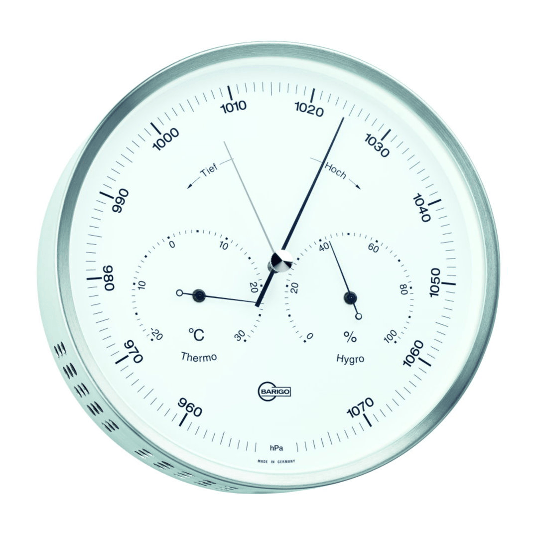 Barigo weerstation met verlichte wijzerplaat met regelbare verlichting. Edelstaal met witte wijzerplaat, uitwendig Ø 162 mm. De regelbare verlichting werkt op het 12 V boordnet. De verlichting is zo in te stellen dat jenachtzicht niet wordt aangetast en maakt het mogelijk om ook ’s nachts snel en accuraat de barometerstand af te lezen.