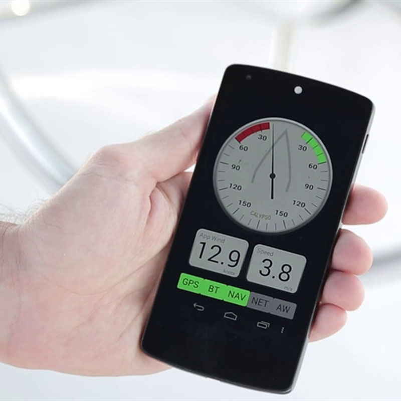 Draadloze ultrasone windsensor/windmeter voor montage boven in de mast of om in de hand te houden, die via Bluetooth 4.1> een keur aan data doorgeeft om via diverse Android en iOs App’s – Sailing Anemotracker(aanbevolen) op een smartphone/tablet/PC uit te lezen. Optionele interface om de via Bluetooth verstuurde data om te zetten naar NMEA0183. Bovenop een solar paneeltje om de interne batterij op te laden.