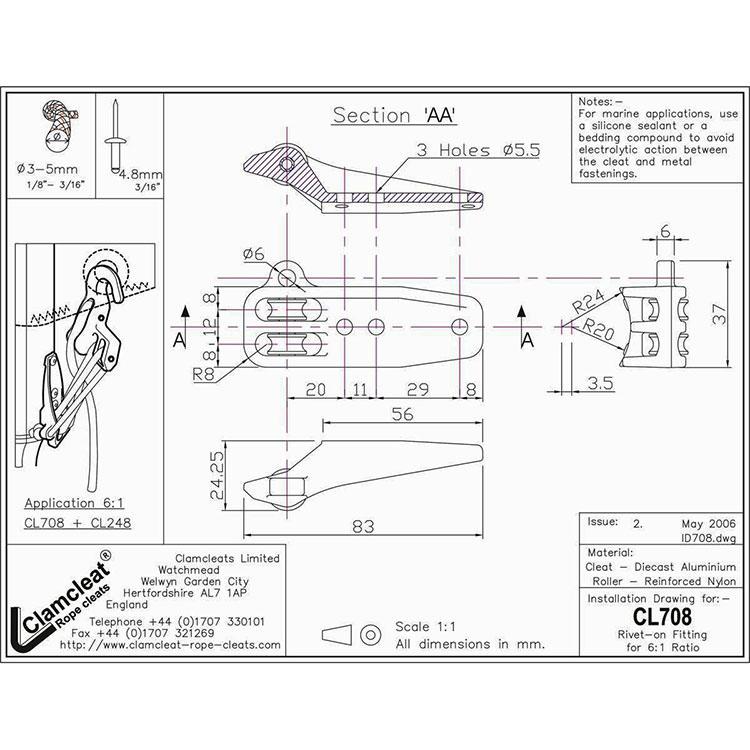 Aluminium Clamcleat® montagedeel voor montage op bijvoorbeeld giek of (meedraaiende)mast voor onderlijkstrekker of halstalie met overbrengingsverhouding 6:1