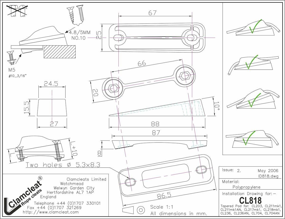 Clamcleat® wig CL818 voor klemmen CL203/236/704 – Polyamide hellend vlak voor het onder helling doorgebout monteren van de Clamcleat CL203 / CL236 / CL704