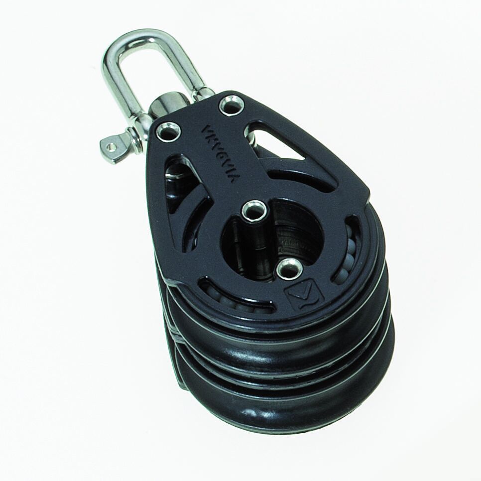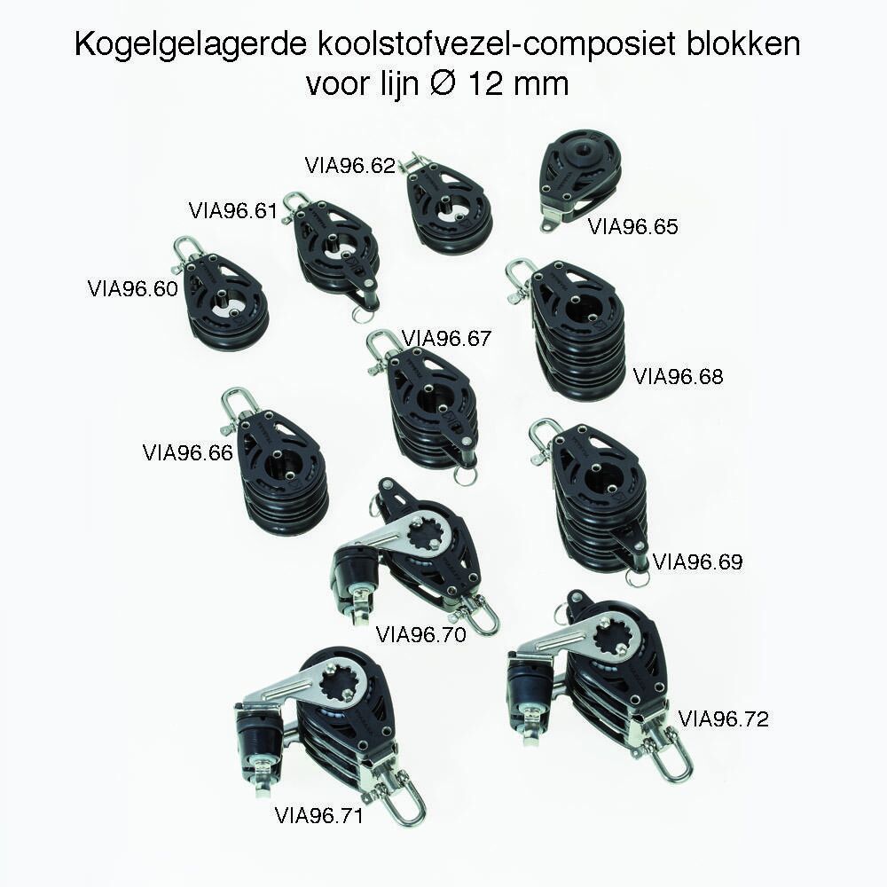 Lichtgewicht koolstofvezel-composiet Delrin® kogelgelagerd dubbelschijfs blok met universele kop voor lijn tot Ø 12 mm, VIA96.66.