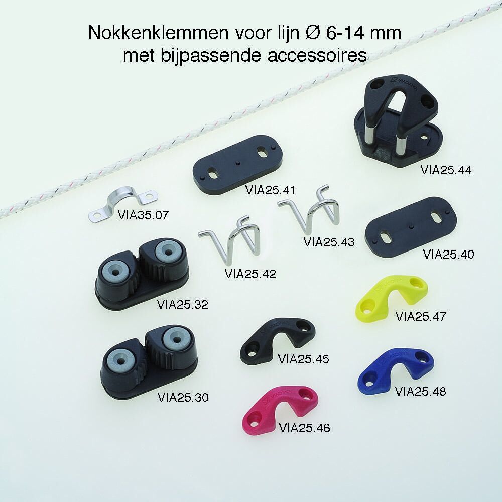 Delrin® kogelgelagerde koolstofvezel-composiet schootklem / camcleat /nokkenklem /servoklem groot, voor lijn Ø 6-14 mm, h-o-h 38 mm. Geschikt voor schoten, trimlijnen, (spinnaker)vallen etc. VIA25.32