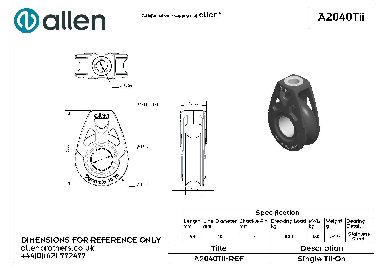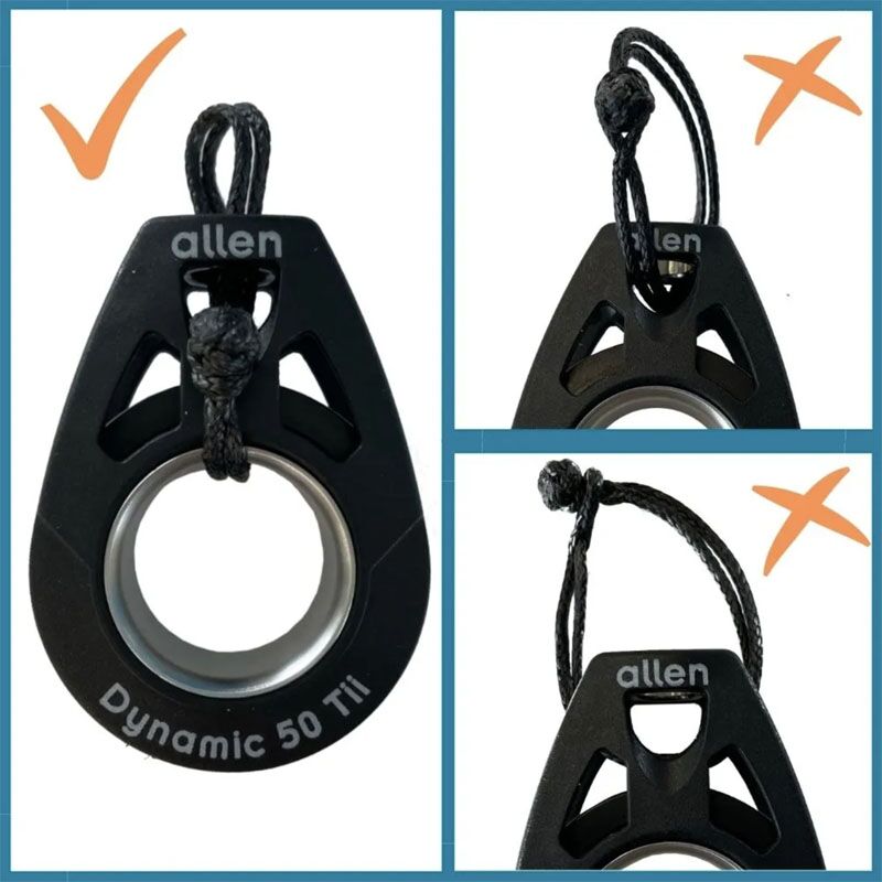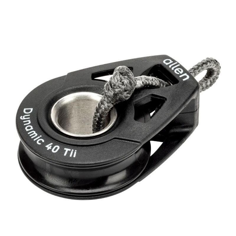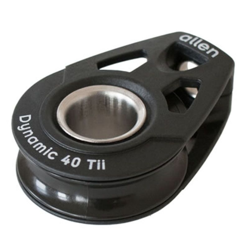 Allen Dynamic 40 Tii compact lichtgewicht koolstofvezel-composiet blok, kogelgelagerd met roestvaststalen kogels voor hoge (piek)belastingen, voor lijn tot Ø 10 mm, ontworpen om met een dyneema strop bevestigd te worden. De grote centrale opening is tevens geschikt als hondsvot. A2040Tii