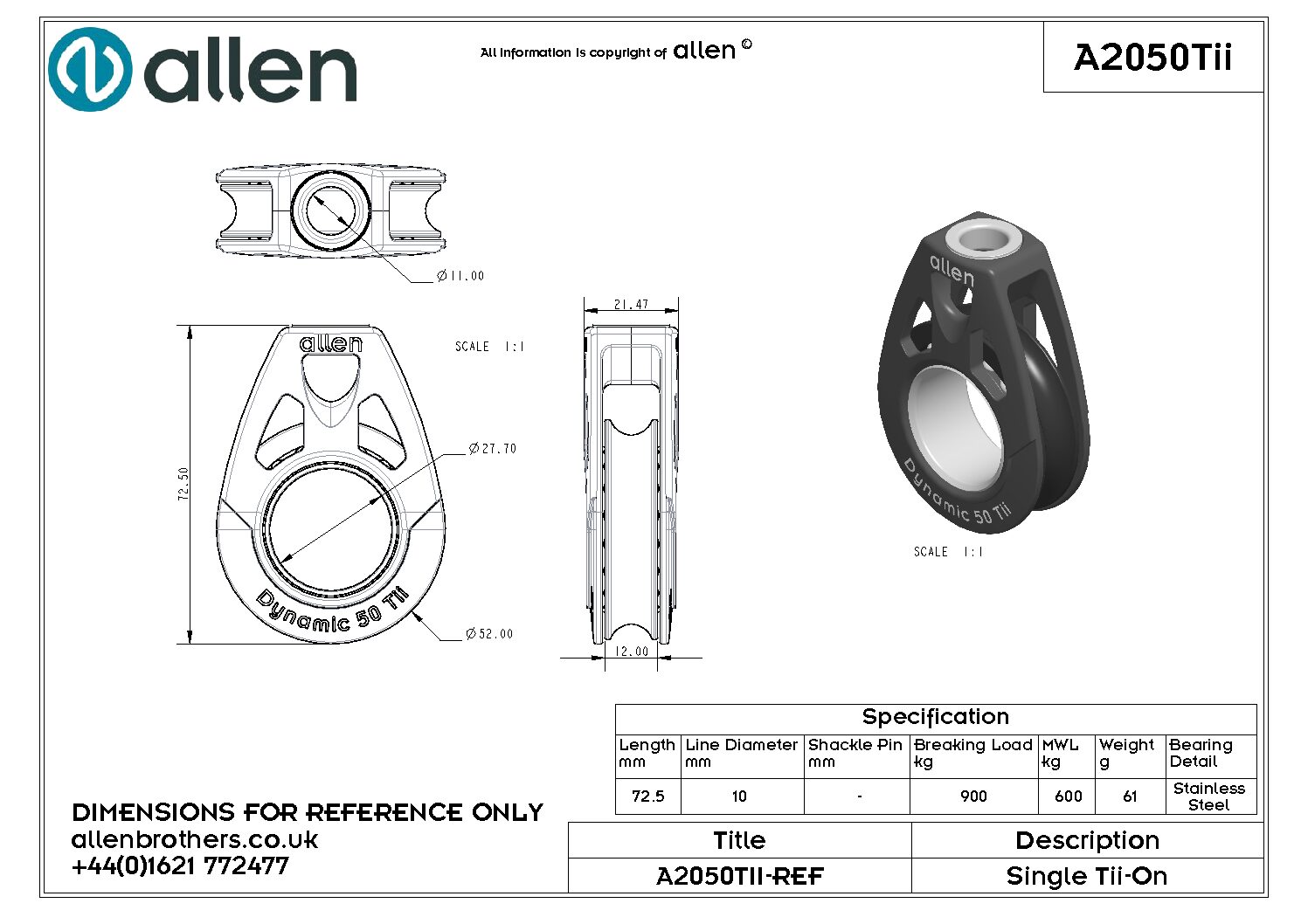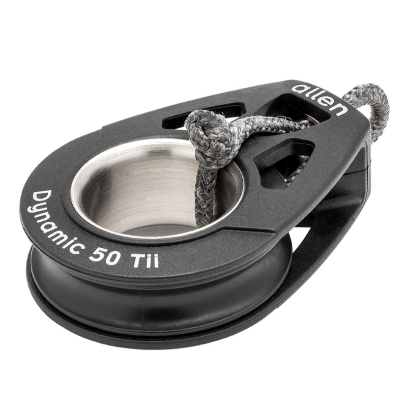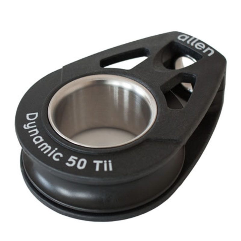 Allen Dynamic 50 Tii lichtgewicht koolstofvezel-composiet blok, kogelgelagerd met roestvaststalen kogels voor hoge (piek)belastingen, voor lijn tot Ø 10 mm, ontworpen om met een dyneema strop bevestigd te worden. De grote centrale opening is tevens geschikt als hondsvot. A2050Tii