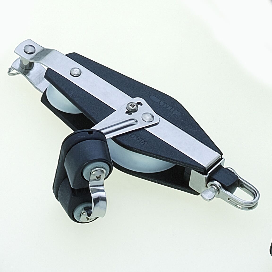Heavy-duty fiddle block with cam cleat and becket, for rope diameter up to Ø 12 mm.