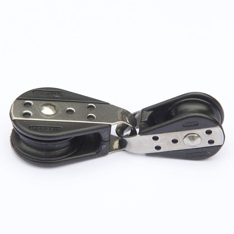 Gekoppelde kogelgelagerde blokken voor lijnen 6 en 8 mm, speciaal voor het grootschootblok dat over de overloop loopt bij b.v. de Laser klasse. Laserparts.