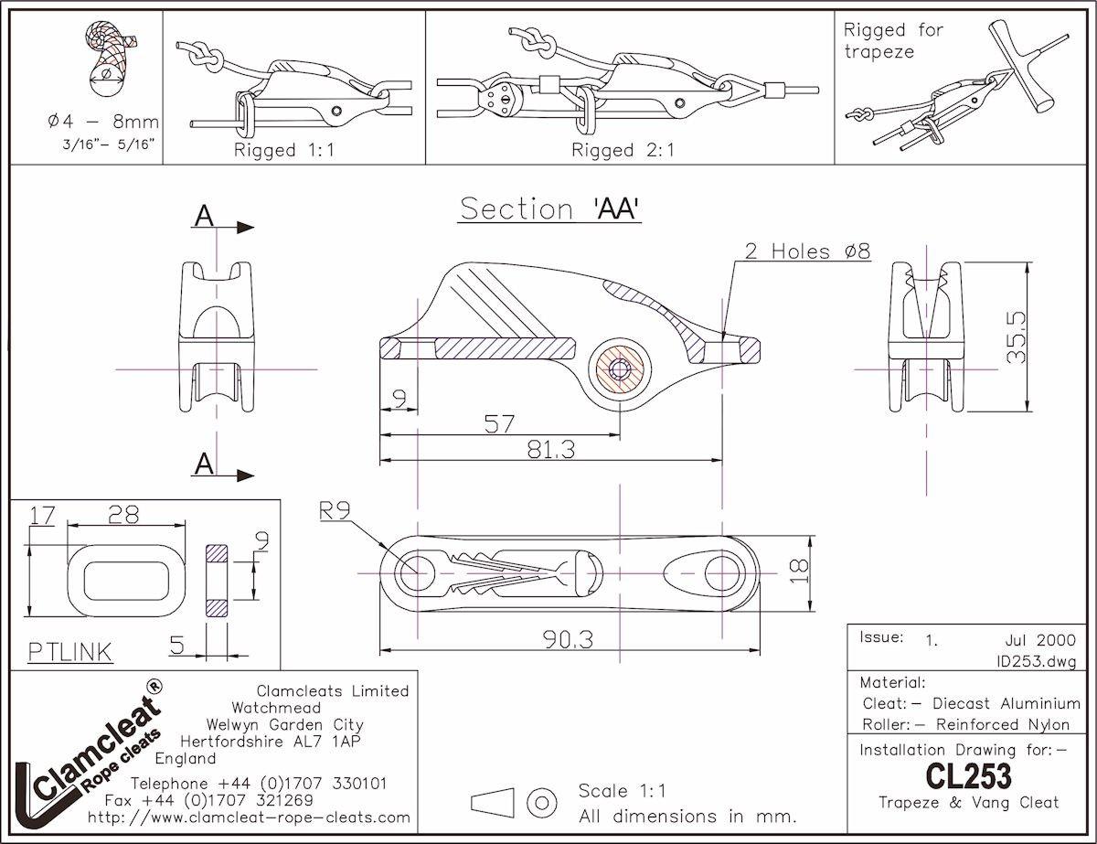 Trapezeklem – Clamcleat® klem CL253 met schijf speciaal voor trapeze lijn Ø 4-8 mm. Trapeze & Vang Cleat with link. VIA26.10.