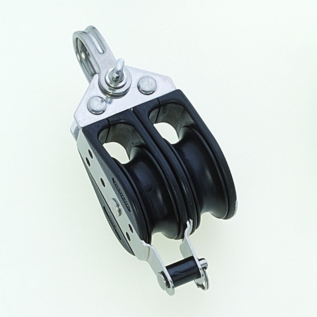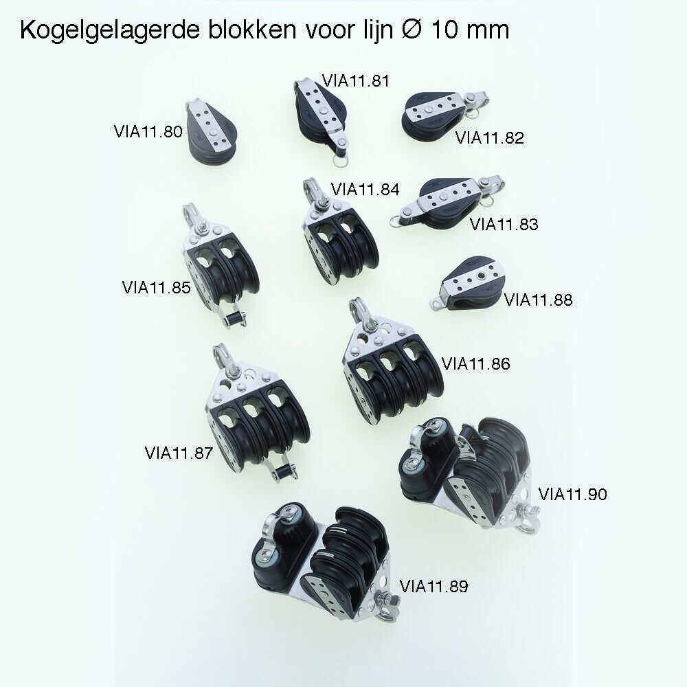 Delrin® kogelgelagerd tweeschijfs of dubbelschijfs blok met hondsvot voor lijn tot Ø 10 mm VIA11.85.