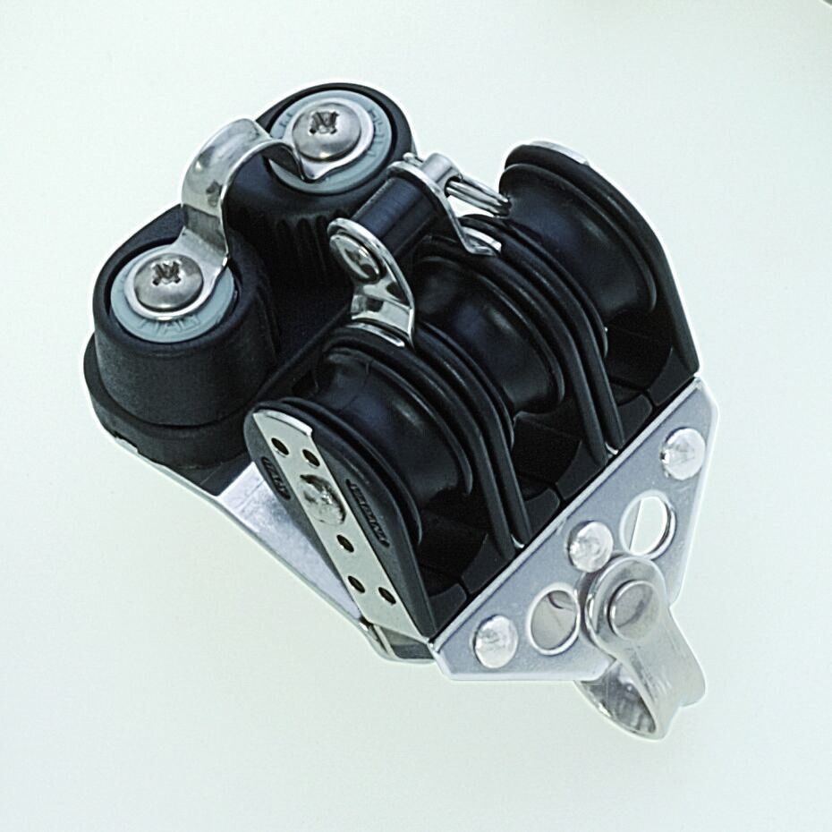 Triple ball bearing block with becket and cam cleat. 3-schijfs blok met hondsvot en nokkenklem / servocleat.