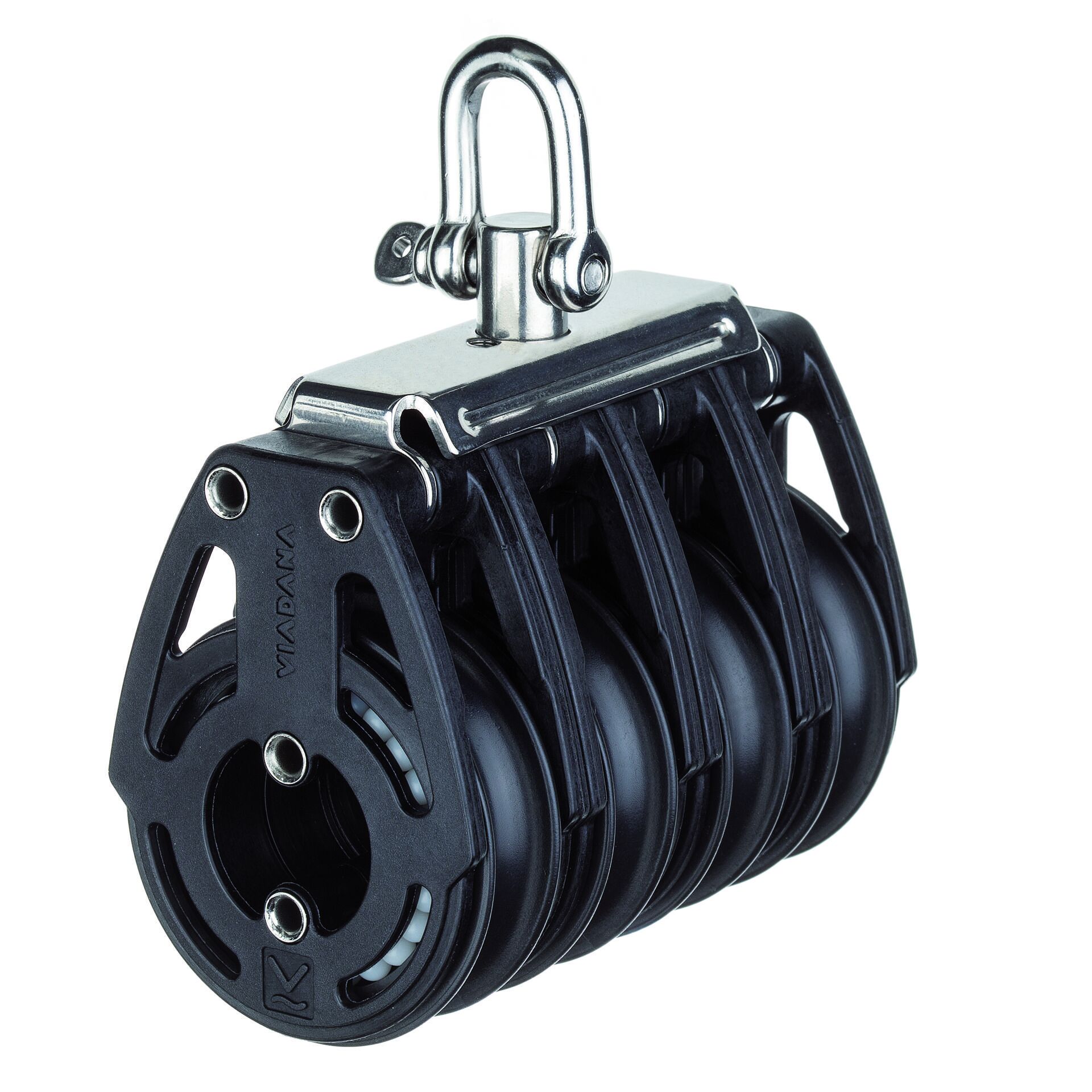 Lichtgewicht koolstofvezel-composiet Delrin® kogelgelagerd vierschijfs blok met universele kop (naar keuze vast te zetten of vrij te draaien/wartelen) voor lijn Ø 10 mm, max Ø 12 mm, VIA96.73