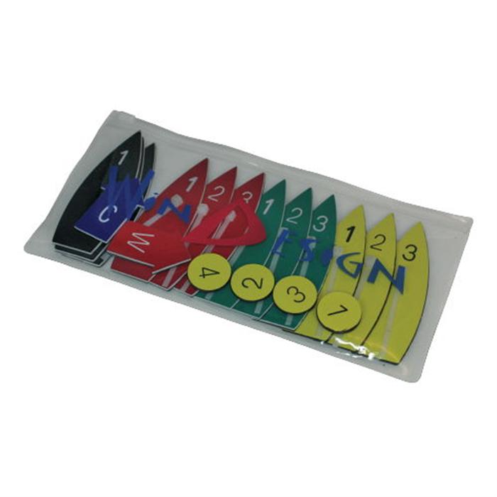 Achttien-delige magnetische bootjes-set voor zeilinstructeurs, trainers, coaches en protestcommissies om situaties met één of meerdere boten uitgebreid uit te beelden.