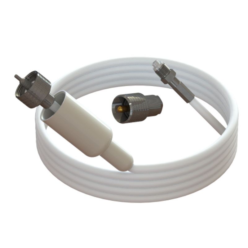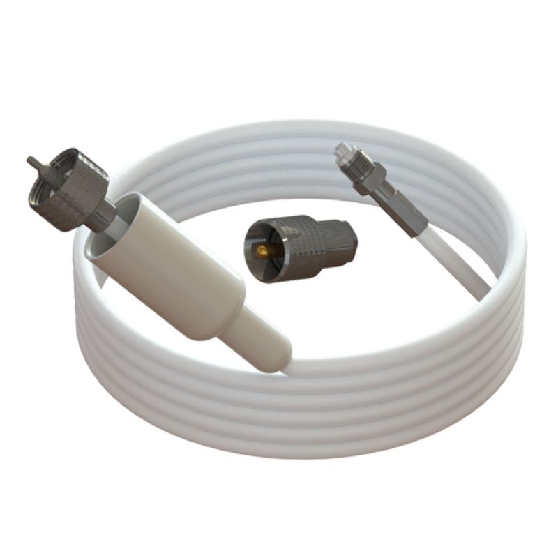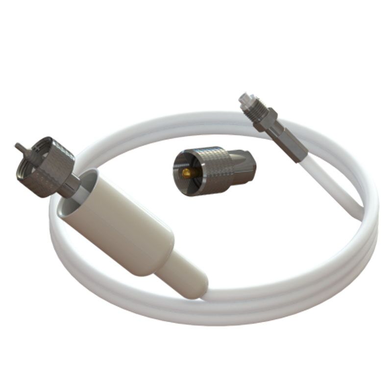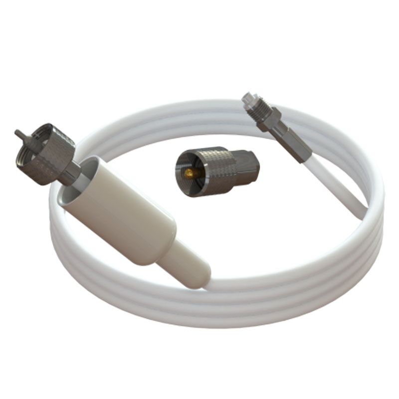 Pacific Aerials low-loss antennekabel – dubbel afgeschermde verliesarme RG58/U coax kabel met aan de antennezijde een aangebouwde standaard PL259 plug en aan de andere zijde een slanke FME vrouwelijke aansluitplug die probleemloos door vrijwel iedere mast getrokken kan worden.