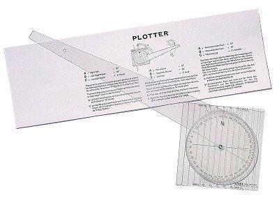 Portland plotter van Linex, navigatieliniaal, koersplotter en positieplotter. Afmetingen: vierkant deel 140 x 140 mm, draaiende liniaal 436 mm lang, 1 mm dik.