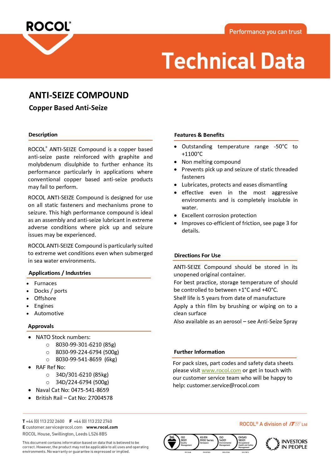 Toepassing: breng met een kwast, spatel of doekje een dunne film Rocol Anti-Seize Compound pasta aan op de schone en droge schroefdraad of andere ondergrond