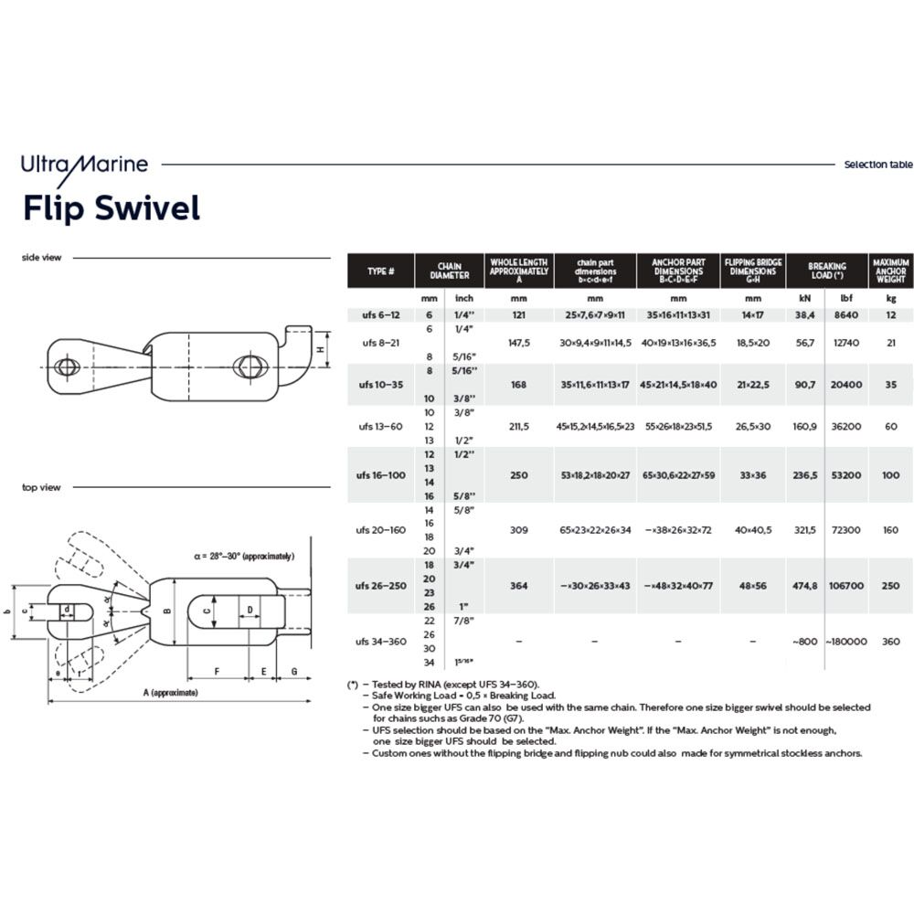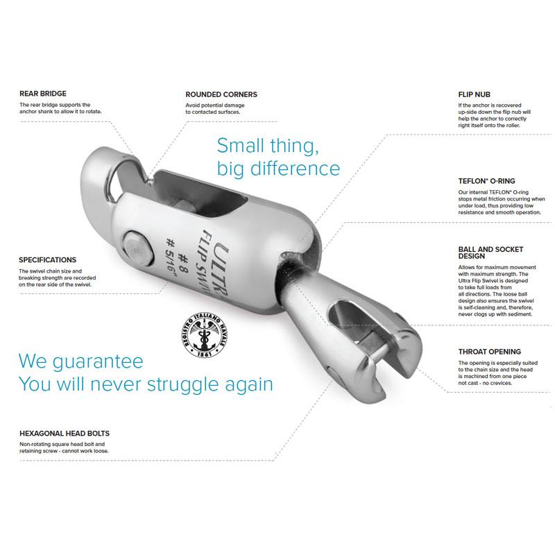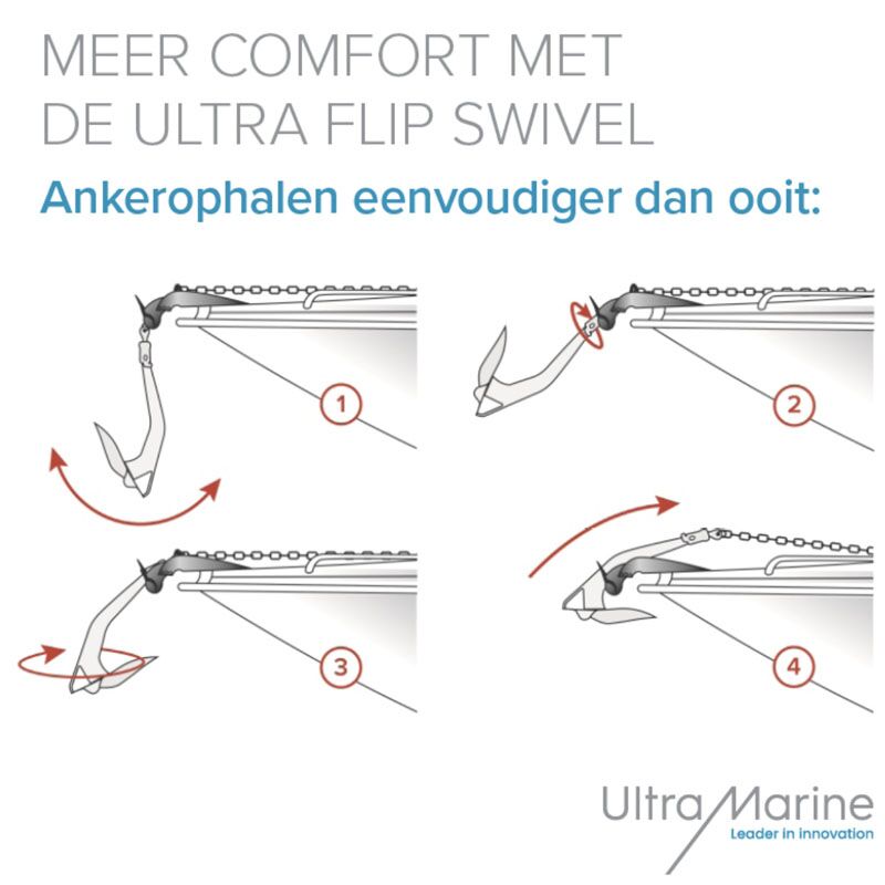 Ultra® Flip Swivel – roestvaststalen ankerwartel met kogelgewricht speciaal ontwikkeld voor de Ultra®-Marine ankers maar ook geschikt voor andere RVS ankers. Dankzij de combinatie van een wartel met een kogelgewricht draait het anker steeds in de juiste positie op de boegrol. Dit filmpje op YouTube illusteert goed het nut van de Ultra® Flip Swivel!