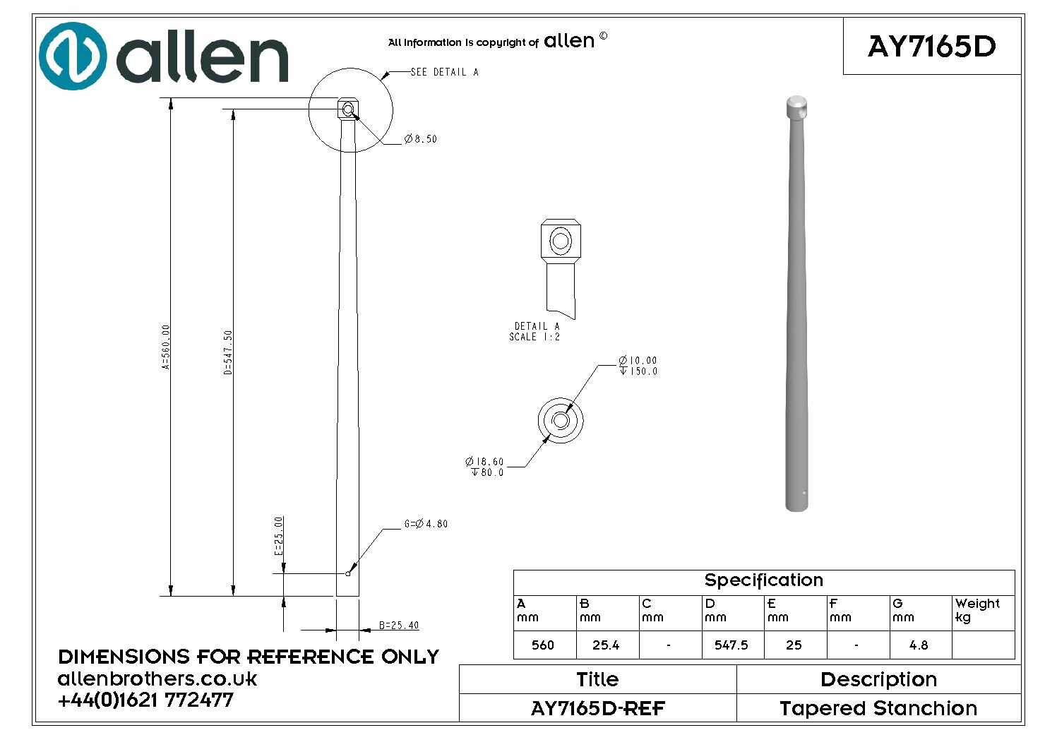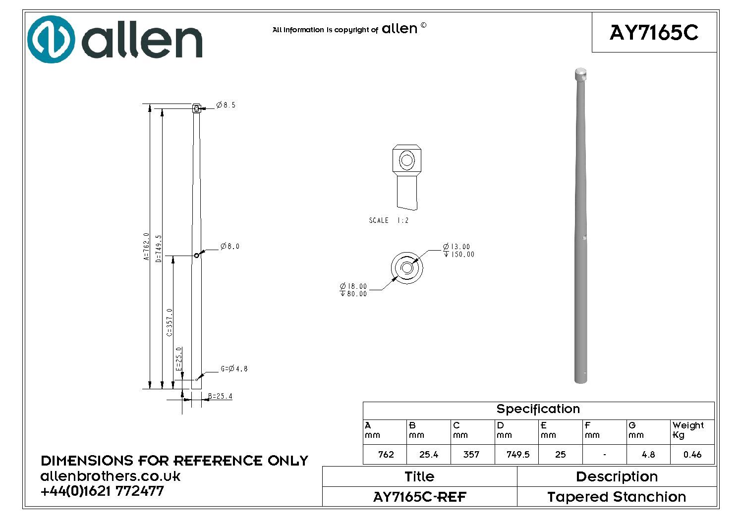 Verjongde aluminium scepterpaal, leverbaar in de nominale hoogtes 50 cm, 60 cm, 62 cm en 75 cm. De nominale hoogte is de hoogte van de (bovenste) railingdraad ten opzichte van onderzijde paal. Met name op aluminium schepen zoals de Ovni heb je met aluminium scepterpalen minder last van galvanische corrosie aan de scepterpotten.