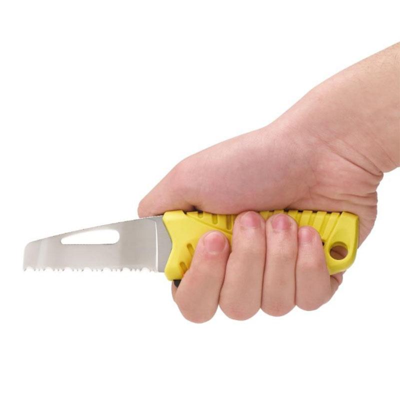 Reddingsmes, reddingmes, duikmes, duikersmes, zeilersmes of noodmes met harpsleutel en vast gekarteld lemmet. Met fluoriserend handvat en schede.
