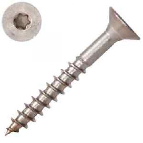 Verzonken houtschroef met versterkte vlakke verzonken kop, Ø 6,0 mm, van zeewaterbestendig roestvrijstaal A4, met T-ster/TX/Torx aandraaivoorziening. Geschikt om platen op hout te schroeven. Double countersunk head timber screws.